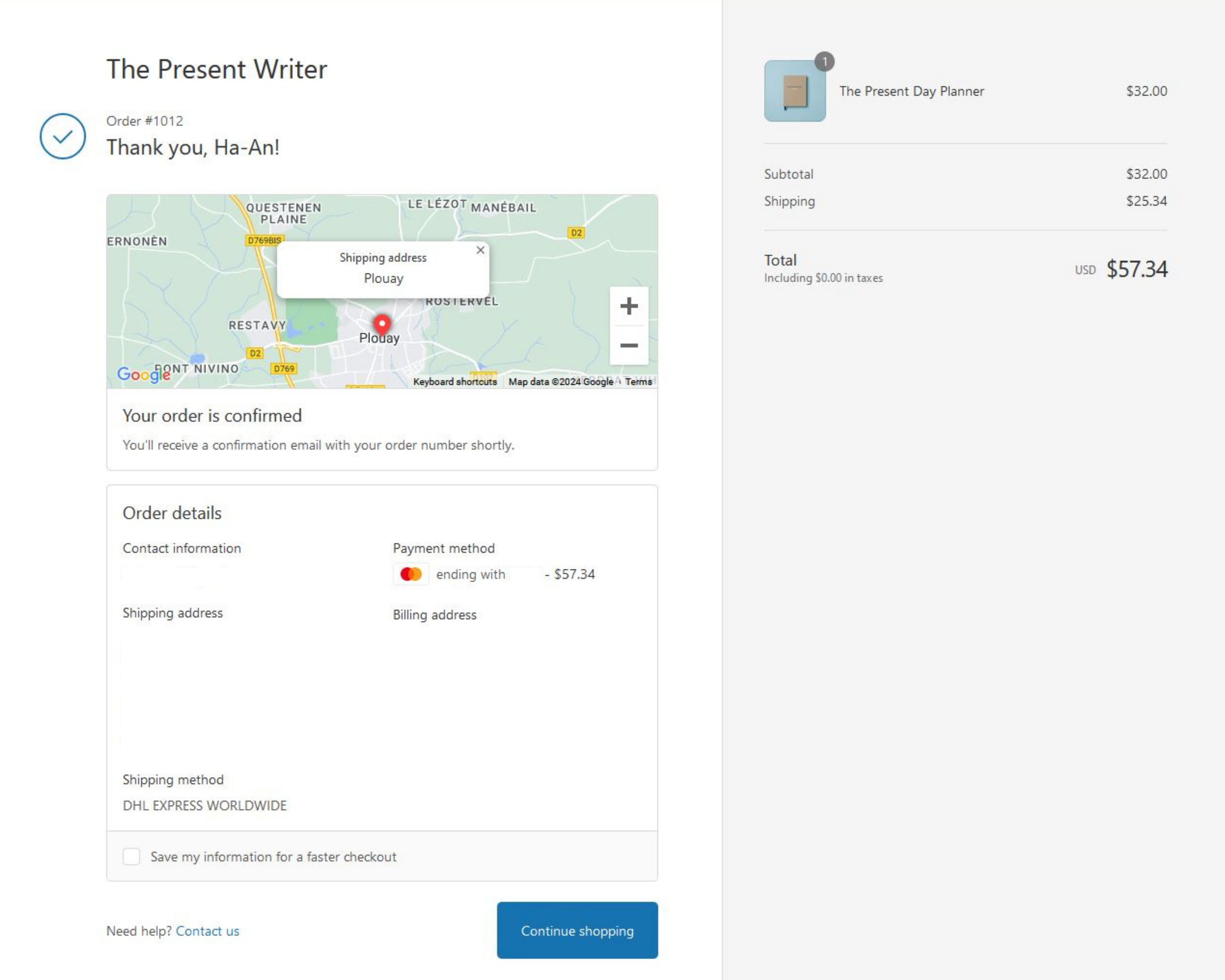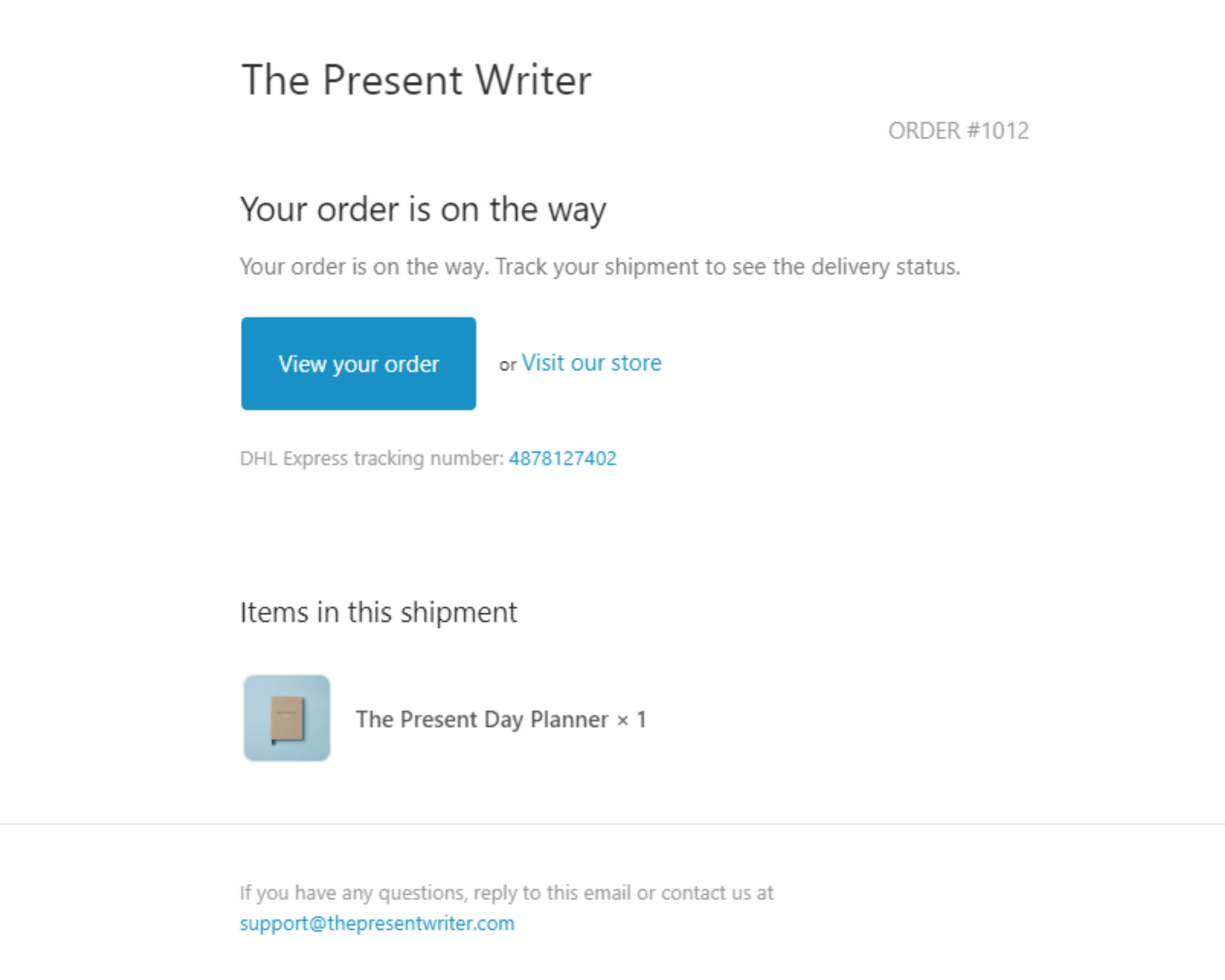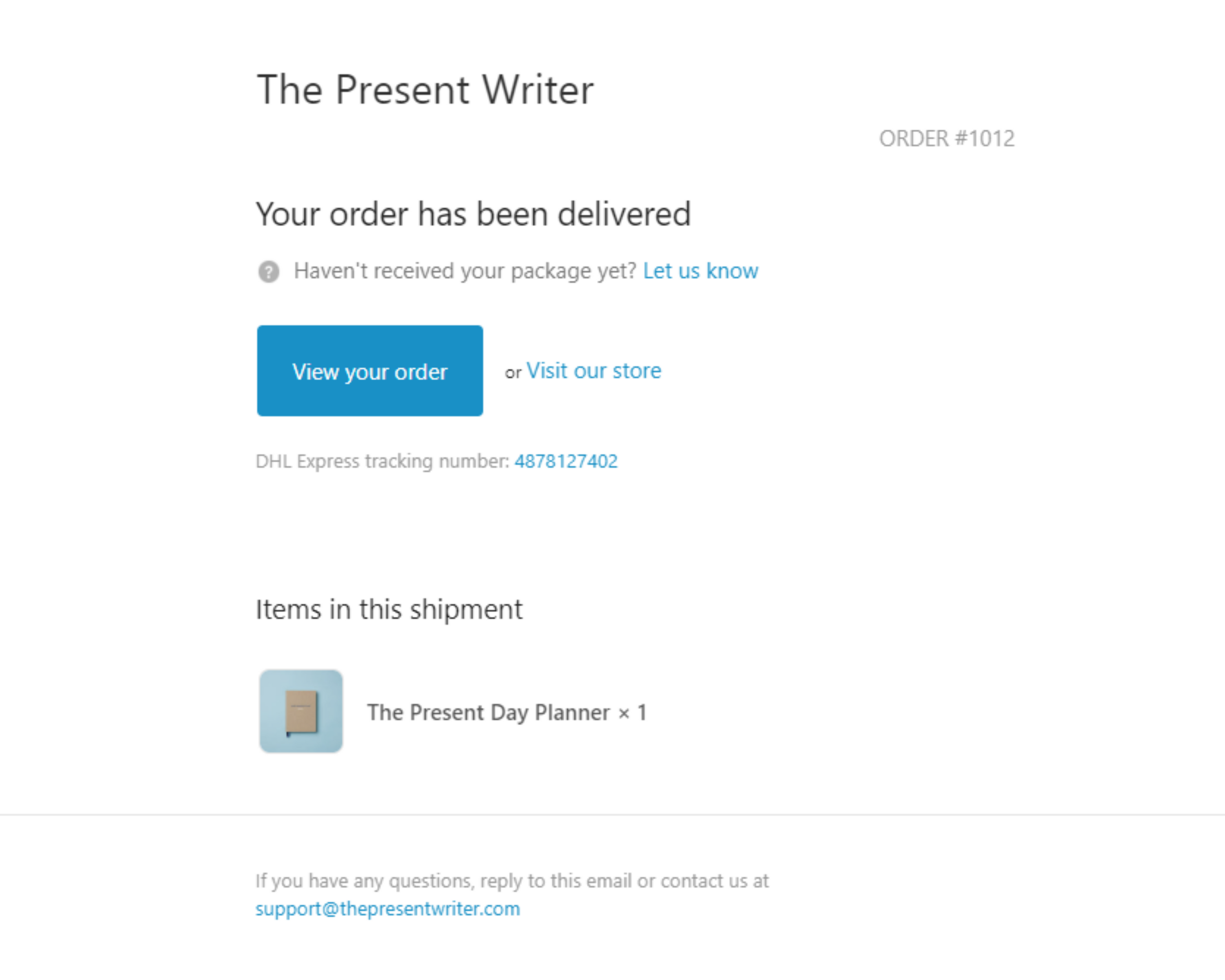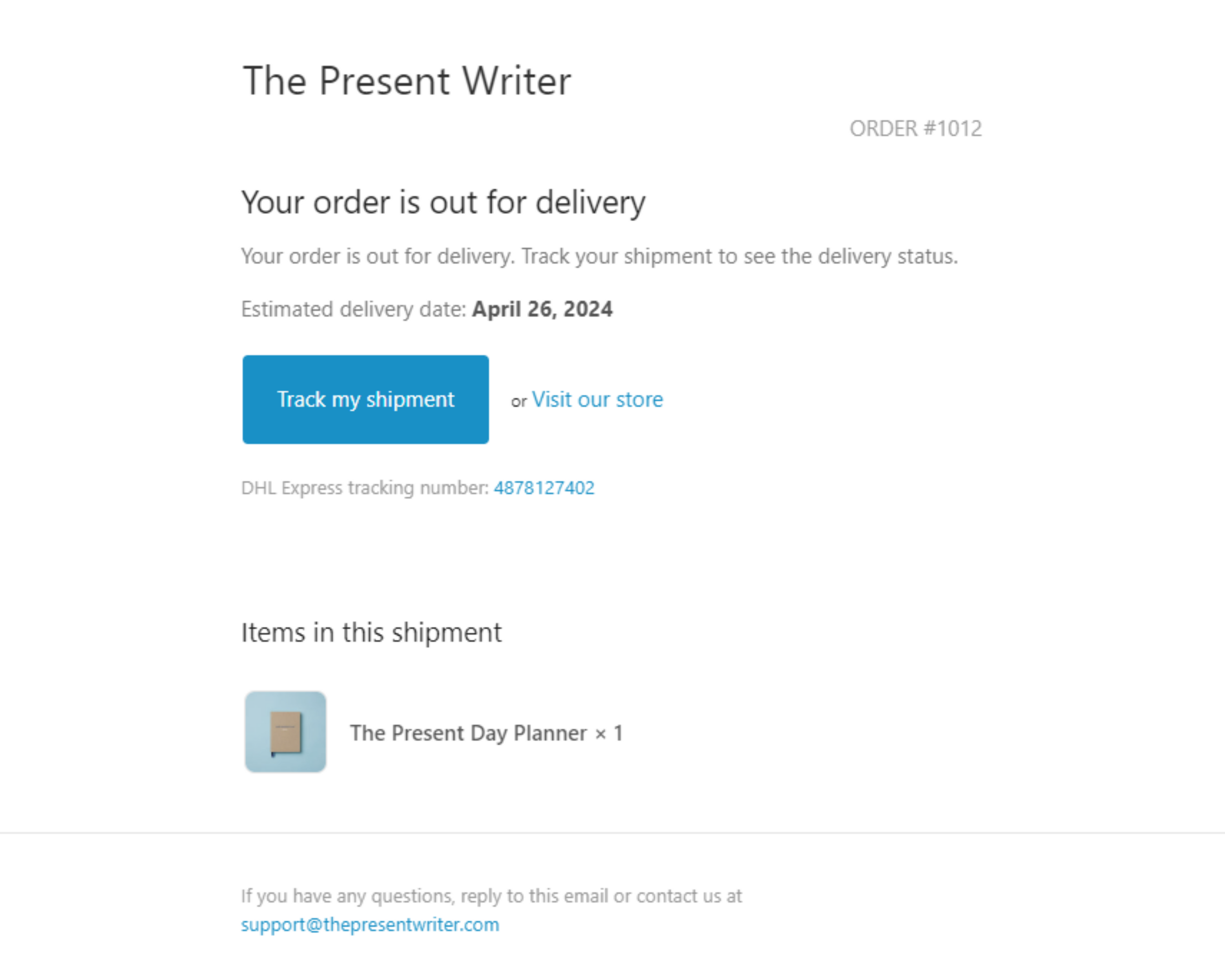 You will receive a final email from support@thepresentwriter.com when your order is delivered at your destination.