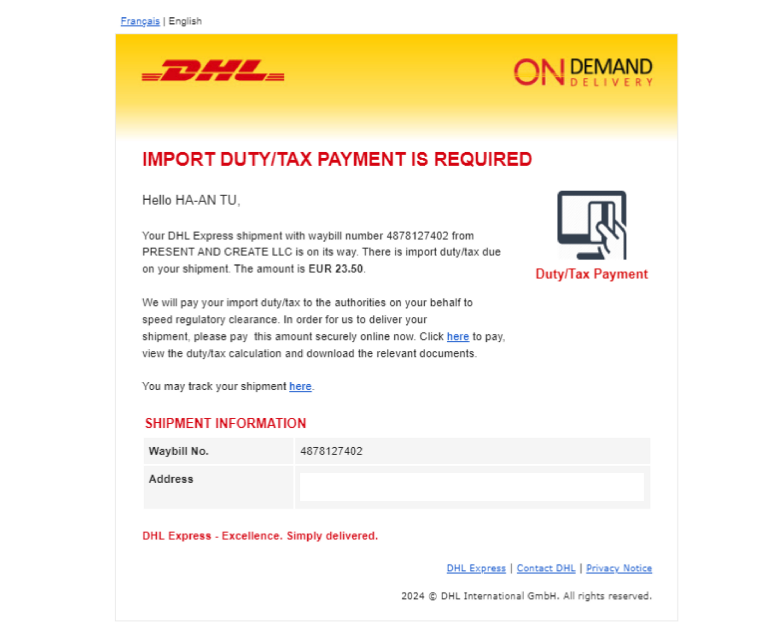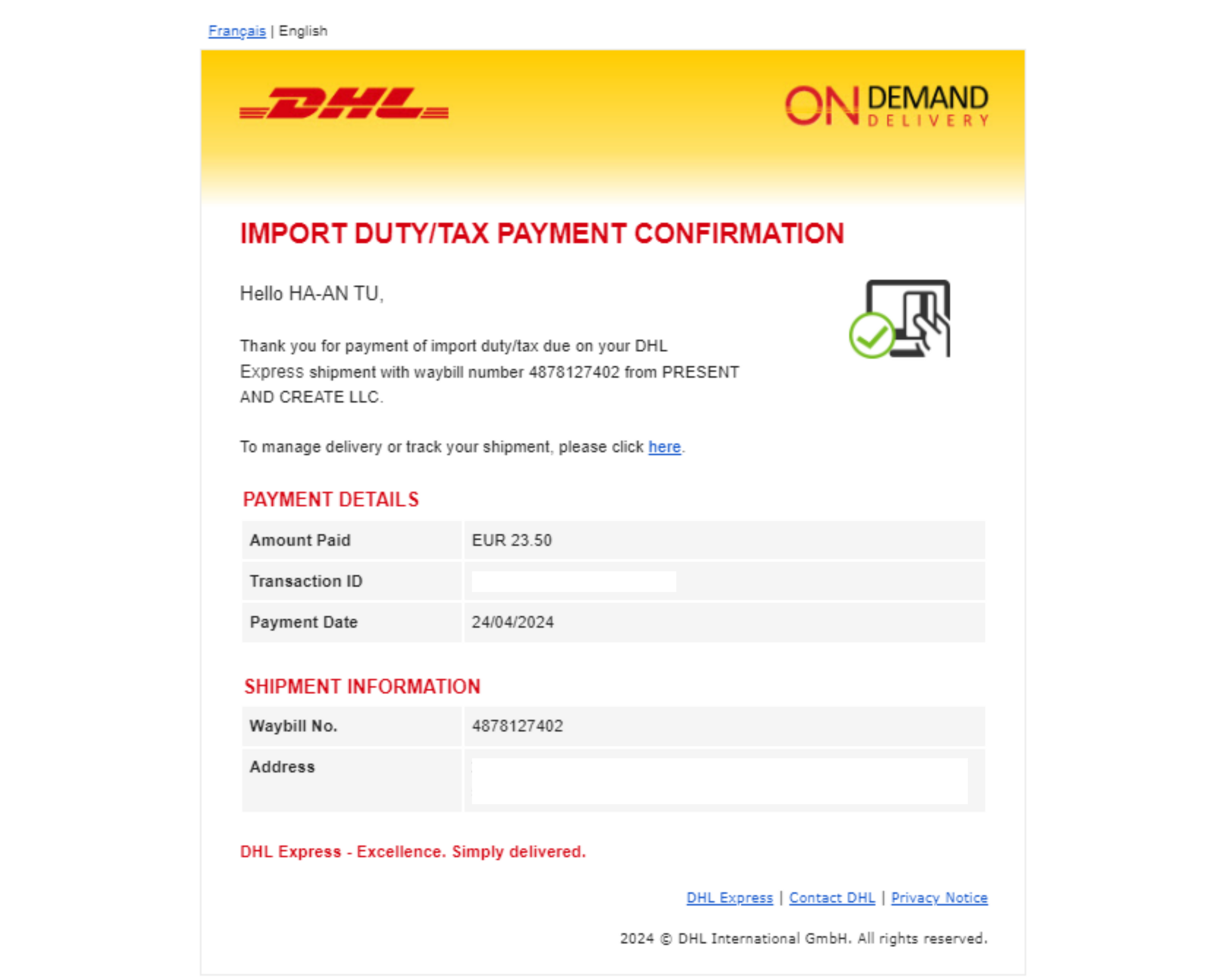 Below is an example of the email you may receive from carrier DHL to notify you that an import duty/tax payment is required, and an example of the payment confirmation email from the carrier DHL after completing the required payment.